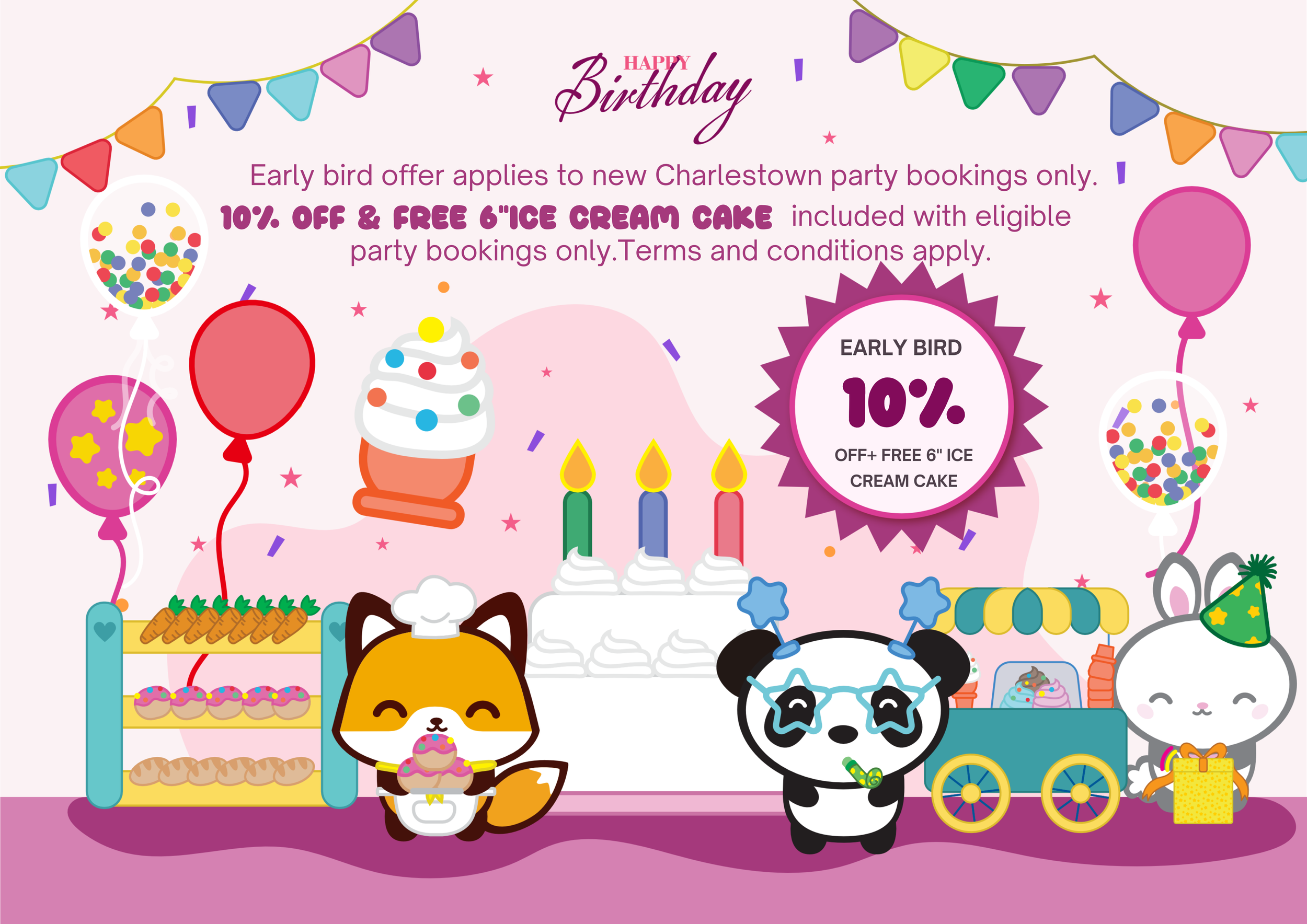 Book your party during our first opening month and enjoy 10% off plus a FREE 6-inch ice cream cake..